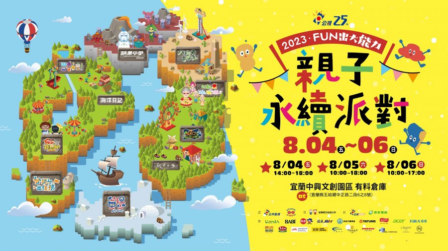 【台北訊】公視25周年兒少系列暑假強檔活動《2023FUN出大能力 親子永續派對》8/4(五)-8/6(日)在宜蘭中興文化創意園區有料倉庫熱烈登場。現場集結公視旗下優質兒少節目《水果冰淇淋》、《妖果小學》、《歐米天空-0.12像素的記憶》、《神廚賽恩師》、《海洋日記》、《WAWA哇!》、《六感實驗室》,以及公視台語台攤位「台語台出任務」結合《收成ê彼一工》、《非常了不起》、客家電視台《GO!蔬菜小隊! 》等豐富的兒少節目,透過互動闖關遊戲,讓兒少從玩樂中學習、認識、提升自己的能力,達到公視堅持寓教於樂的理念。