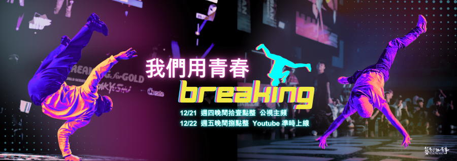 〈我們用青春Breaking〉在12月21日週四晚間十一點半於公視頻道播出,週五晚上八點於 《藝術很有事》youtube頻道上架。詳情請上公視《藝術很有事》臉書粉絲專頁查詢 https://www.facebook.com/pts.insidethearts