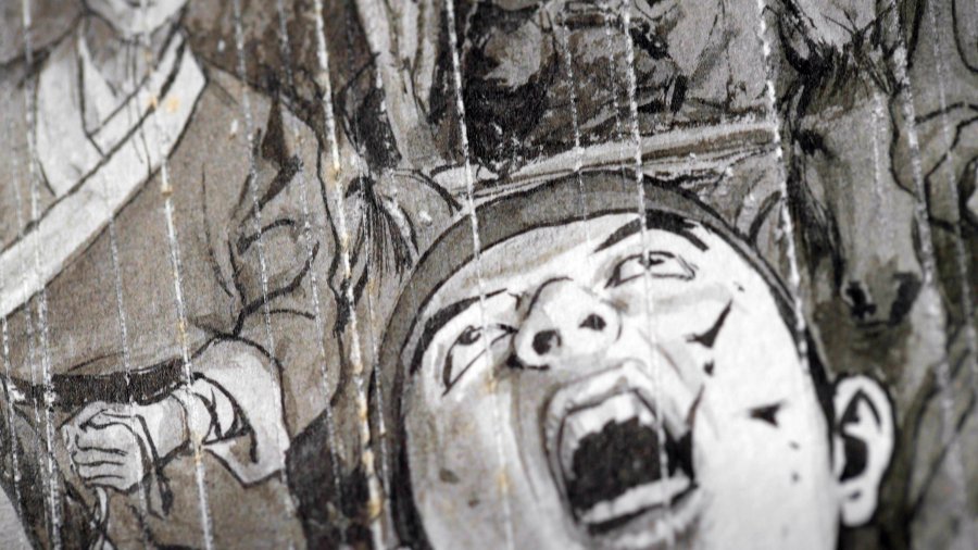 鄭詠中翻開1992年陳弘耀的嘔心瀝血作品《赤狐》原作,更可見陳弘耀「狠心破壞原稿式」的作畫方式,用刀片切掉部分水彩紙,背後直接粘上宣紙,再用刀割出細細的雨絲,做到他要的效果。陳弘耀說:「如果割壞了,就再花三天把它畫回來!」
