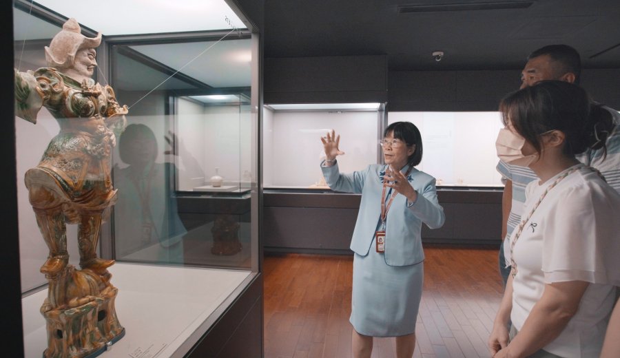而在展場第一線,與觀眾最直接互動的,則是一群被譽為「志工界天花板」的導覽志工。服務超過三十五年的資深導覽志工王雪吟笑稱自己是「白髮宮女」。她認為,導覽不只是背誦資料,更要與文物建立連結,將知識轉化為故事,讓觀眾真正走進歷史。她也提到,在志工忙碌之餘,她要不斷地與國寶文物「對話」,才能讓越來越多民眾反覆回訪、指定導覽主題。